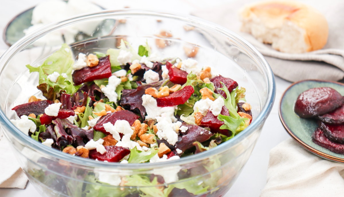 Creamy goat cheese with its slightly tangy flavor, toasted walnuts with their crunch and nutty notes and the tender beets with their stunning color, all add dimension to this salad recipe.