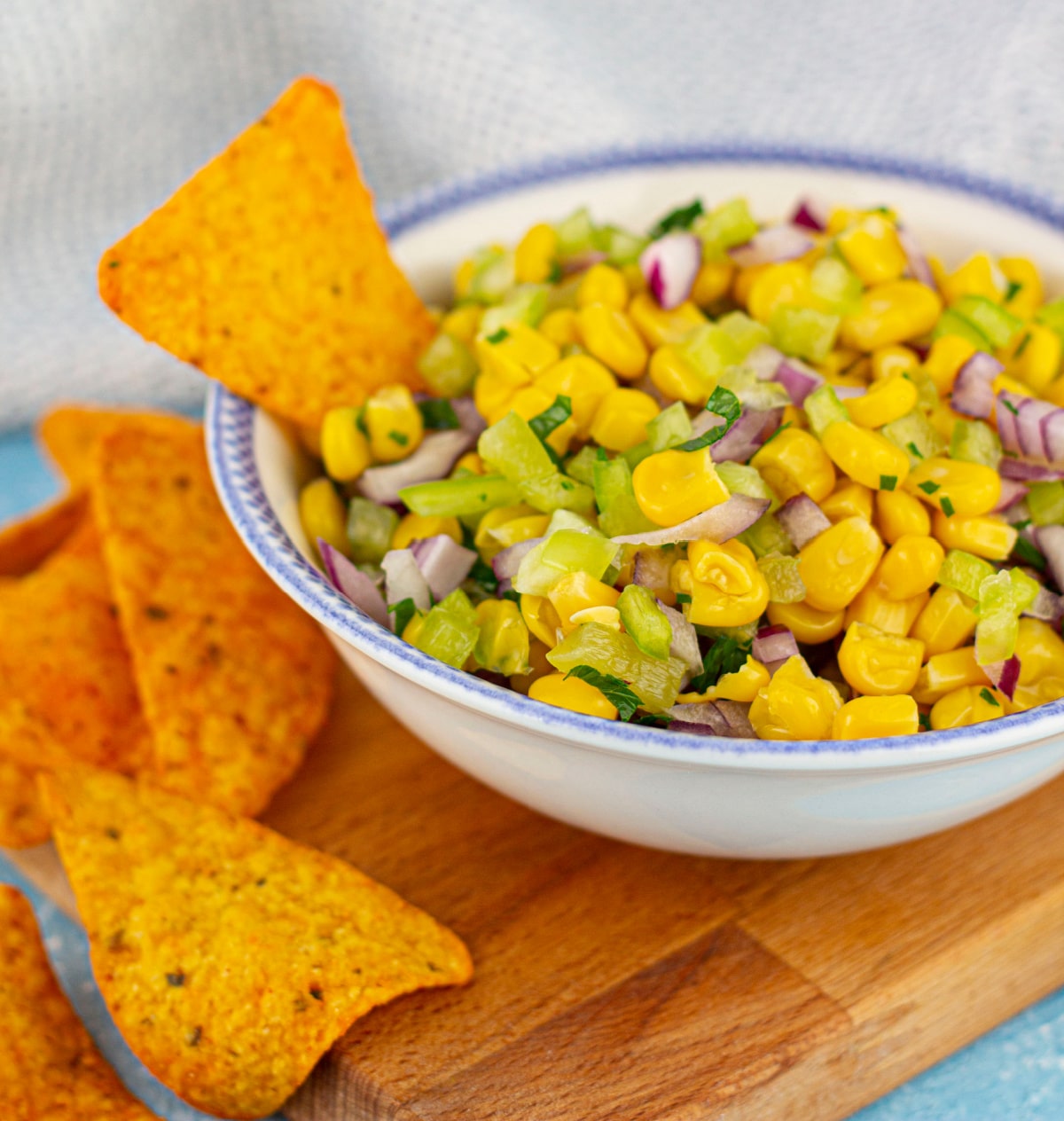 Made with just a few ingredients, this tasty and fresh corn salsa is delicious with tortilla chips and as a topping for tacos.