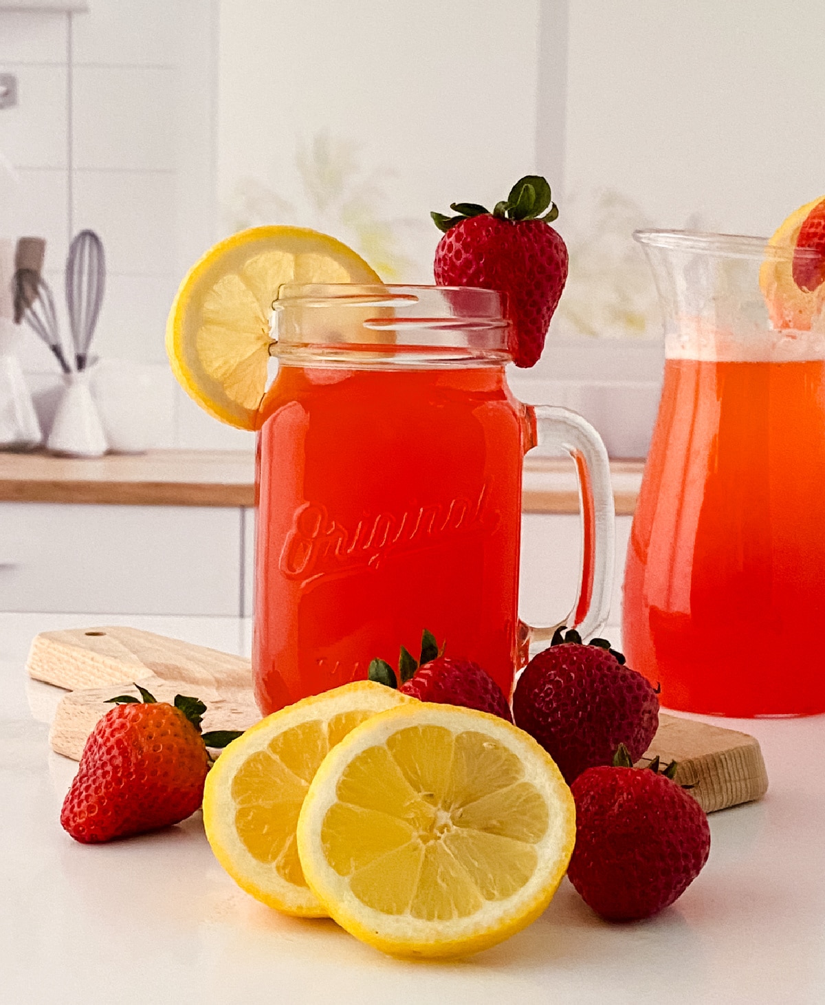 Everyone loves a tall glass of lemonade and adding fresh strawberries makes it even tastier and adds a beautiful pink hue.
